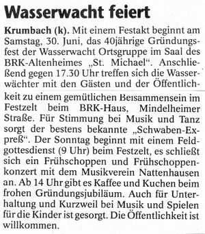 Bericht am 29.06.1990 in den Mittelschwäbischen Nachrichten Geschrieben von Nico-Alexander Harder (KV Günzburg) am 29. Juni 1990. Veröffentlicht in Zeitungsartikel. Zurück Weiter Nico-Alexander Harder (KV Günzburg)