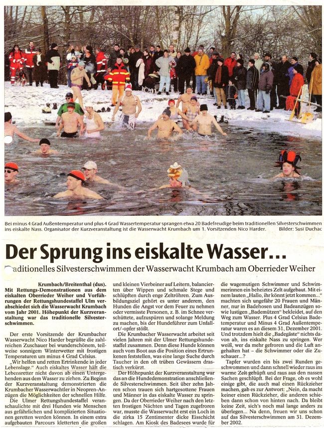 Bericht am 04.01.2002 in den Mittelschwäbischen Nachrichten Geschrieben von Nico-Alexander Harder (KV Günzburg) am 4. Januar 2001. Veröffentlicht in Zeitungsartikel. Silvesterschwimmen Zurück Weiter Nico-Alexander Harder (KV Günzburg)