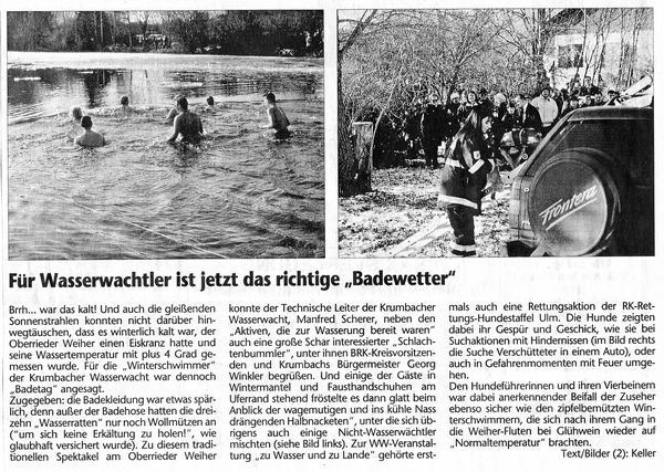 Bericht am 14.01.2001 in den Mittelschwäbischen Nachrichten Geschrieben von Nico-Alexander Harder (KV Günzburg) am 14. Januar 2001. Veröffentlicht in Zeitungsartikel. Silvesterschwimmen Zurück Weiter Nico-Alexander Harder (KV Günzburg)