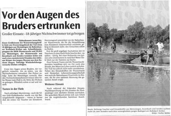 Bericht am 10.08.2001 in den Mittelschwäbischen Nachrichten Geschrieben von Nico-Alexander Harder (KV Günzburg) am 10. August 2001. Veröffentlicht in Zeitungsartikel. Einsatz Zurück Weiter Nico-Alexander Harder (KV Günzburg)