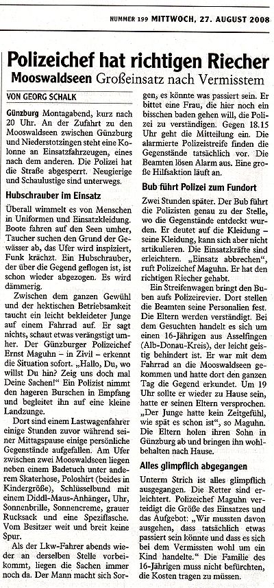 Bericht am 27.08.2008 in den Mittelschwäbischen Nachrichten Geschrieben von Nico-Alexander Harder (KV Günzburg) am 27. August 2008. Veröffentlicht in Zeitungsartikel. Einsatz Zurück Weiter Nico-Alexander Harder (KV Günzburg)