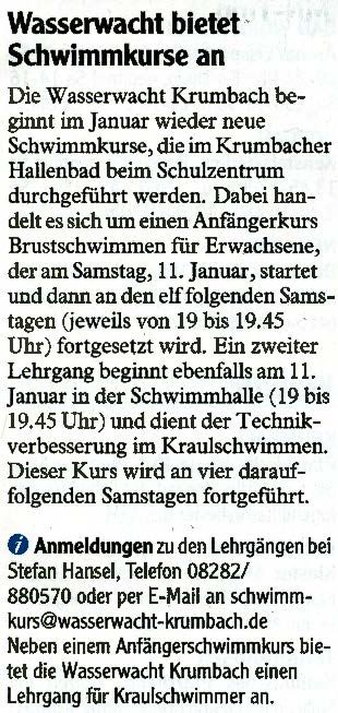 Bericht am 21.12.2013 in den Mittelschwäbischen Nachrichten Geschrieben von Nico-Alexander Harder (KV Günzburg) am 21. Dezember 2013. Veröffentlicht in Zeitungsartikel. Schwimmkurs Zurück Weiter Nico-Alexander Harder (KV Günzburg)