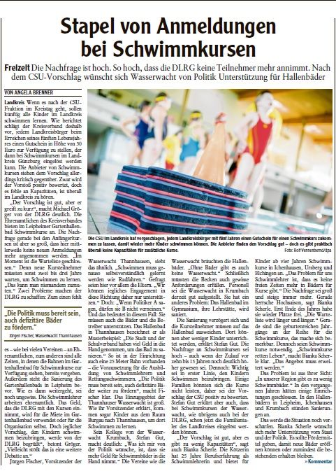 Mittelschwäbische Nachrichten vom 15.März 2019 Seite 25 Geschrieben von Nico-Alexander Harder (KV Günzburg) am 15. März 2019. Veröffentlicht in Zeitungsartikel. Kinderschwimmkurs, Schwimmkurs Zurück Weiter Nico-Alexander Harder (KV Günzburg)