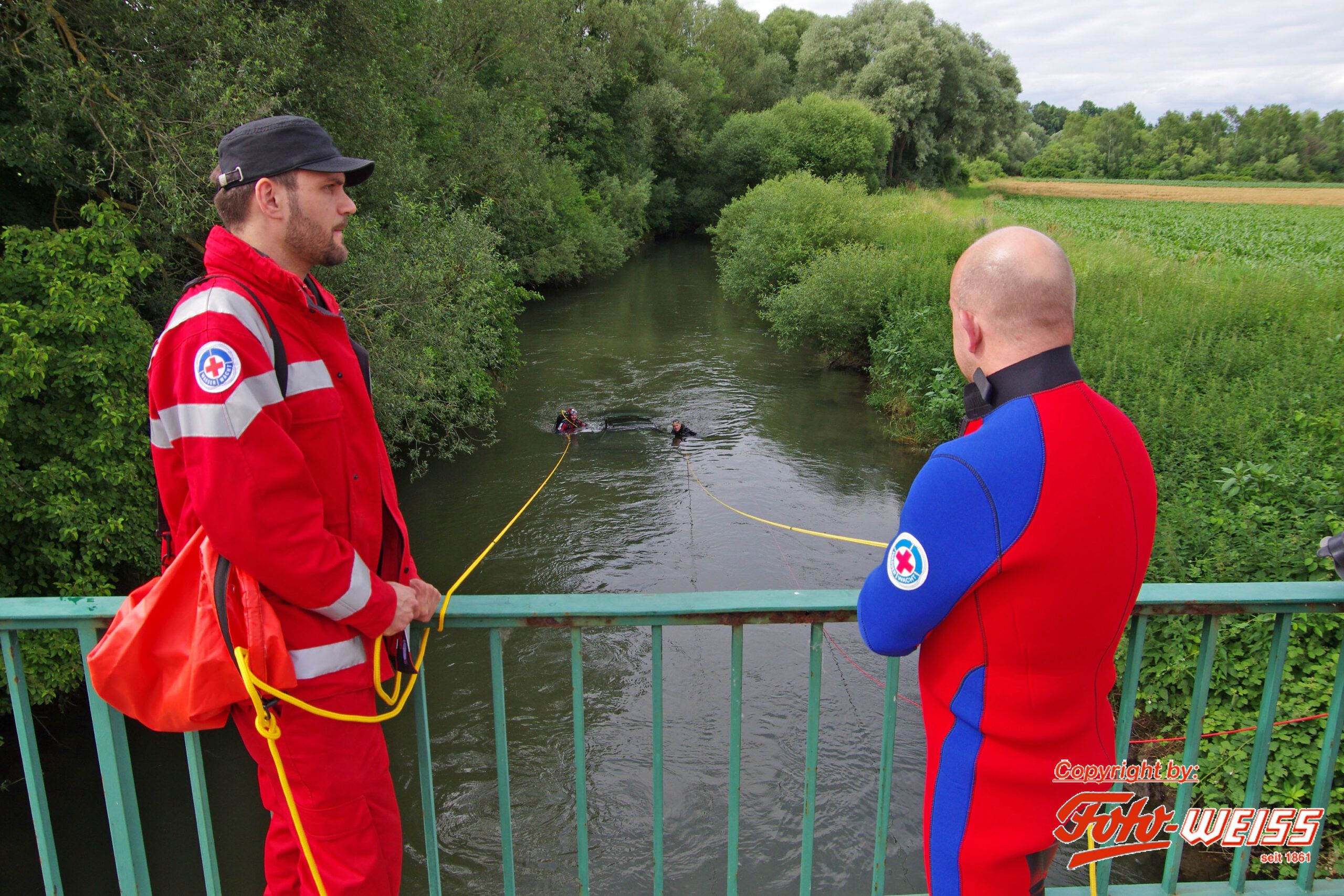 Eine ältere Dame war im See und hielt sich an der Badeleiter des Steges fest. Sie wurde von einem vorbeifahrenden Autofahrer gesehen, der sofort einen Notruf absetzte und versuchte die Frau aus dem See zu retten. Der Hund der Frau trieb leblos im See. Anfangs lag der Verdacht nahe die Frau war vielleicht beim Versuch ihren Hund zu retten selbst in Not geraten. Jedoch kurz vor unserem Eintreffen wurde auch noch eine ertrunkene Katze in einem Transportkäfig aus dem See geborgen. Diese merkwürdige Lage veranlasste uns den näheren Umkreis um den Steg mit Tauchern abzusuchen. Wir konnten aber bei hervorragender Sicht nichts weiteres finden.
