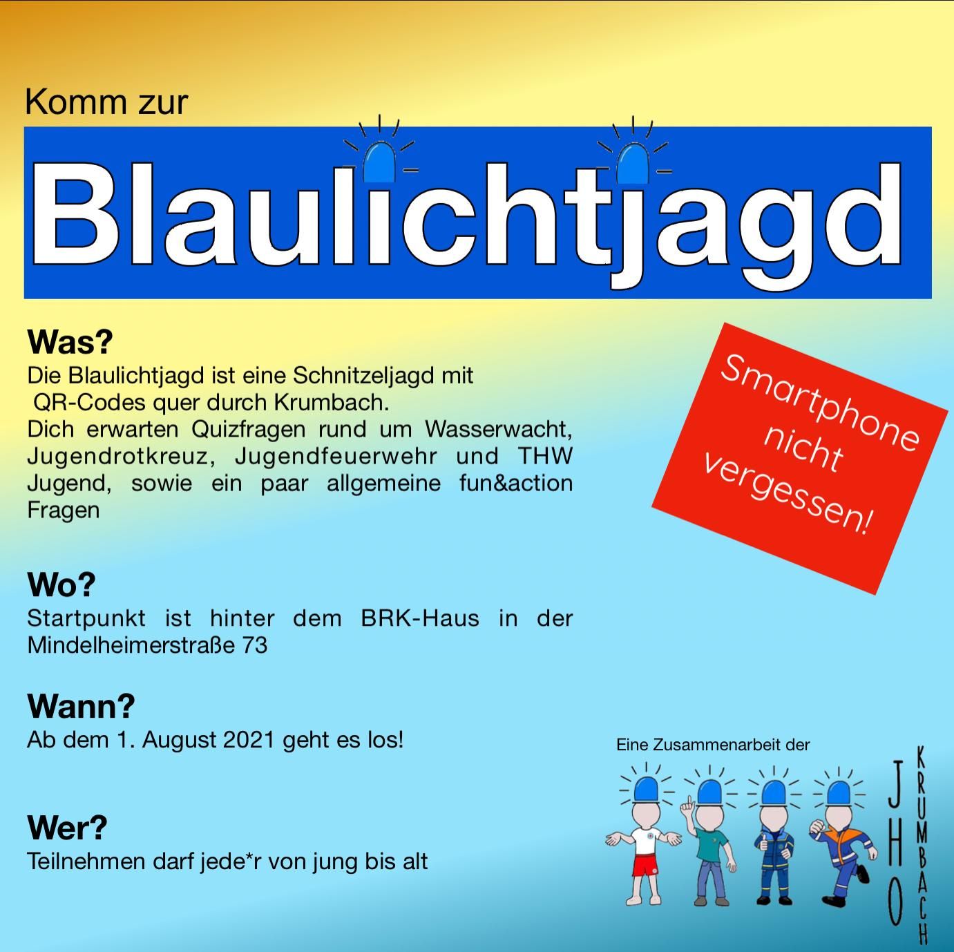 Die Jugendhilfsorganisationen Krumbachs, kurz JHO, bestehend aus Jugendfeuerwehr, Jugendrotkreuz, Wasserwacht Jugend und THW Jugend, laden euch herzlich zu ihrer Blaulichtjagd ein.