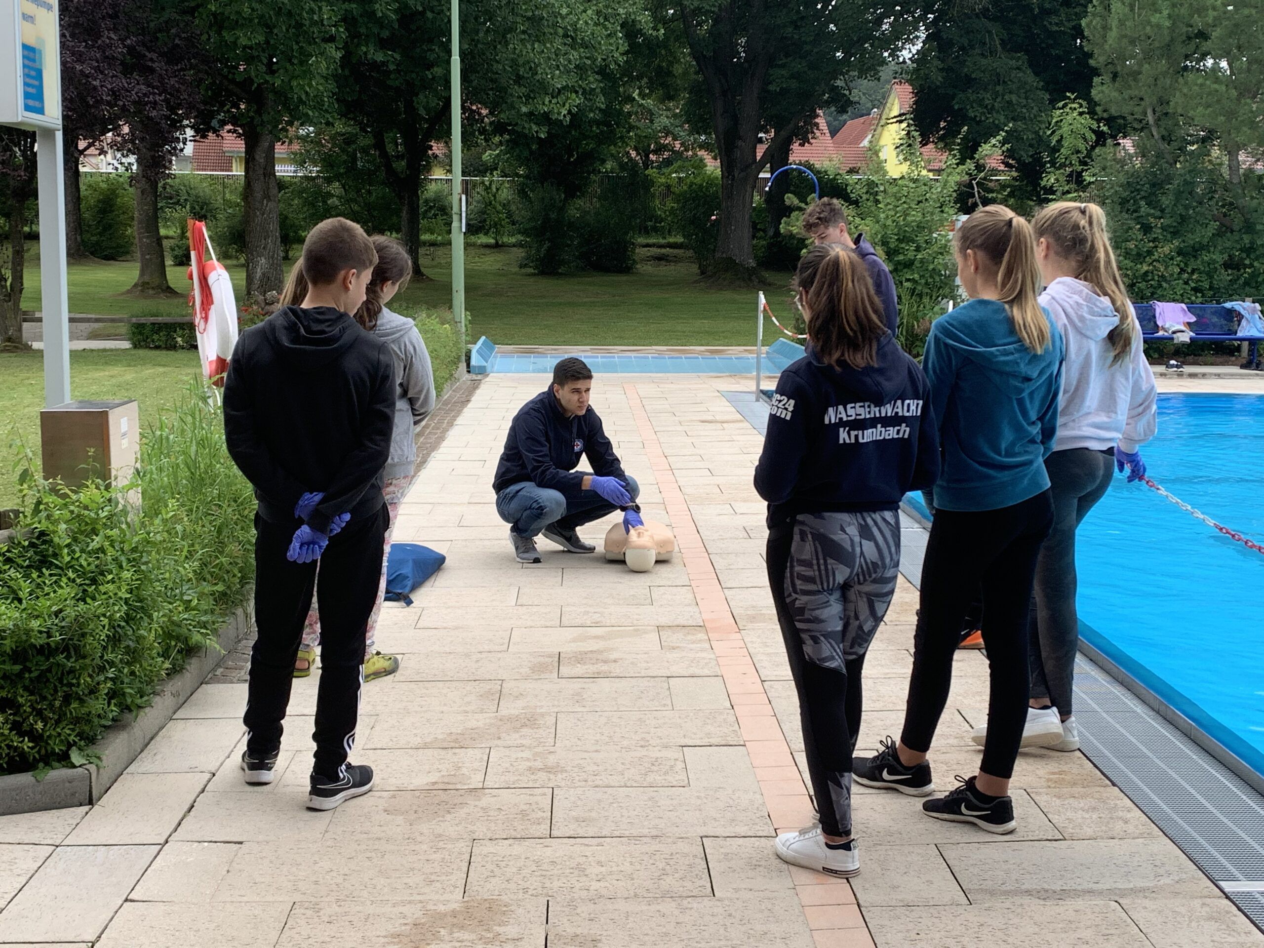 Die Wasserwacht Krumbach bildet aktuell Teile der 1. Mannschaft der Schwimm-Sport-Gemeinschaft Günzburg-Leipheim (SSG) im Krumbacher Freibad als Rettungsschwimmer aus.