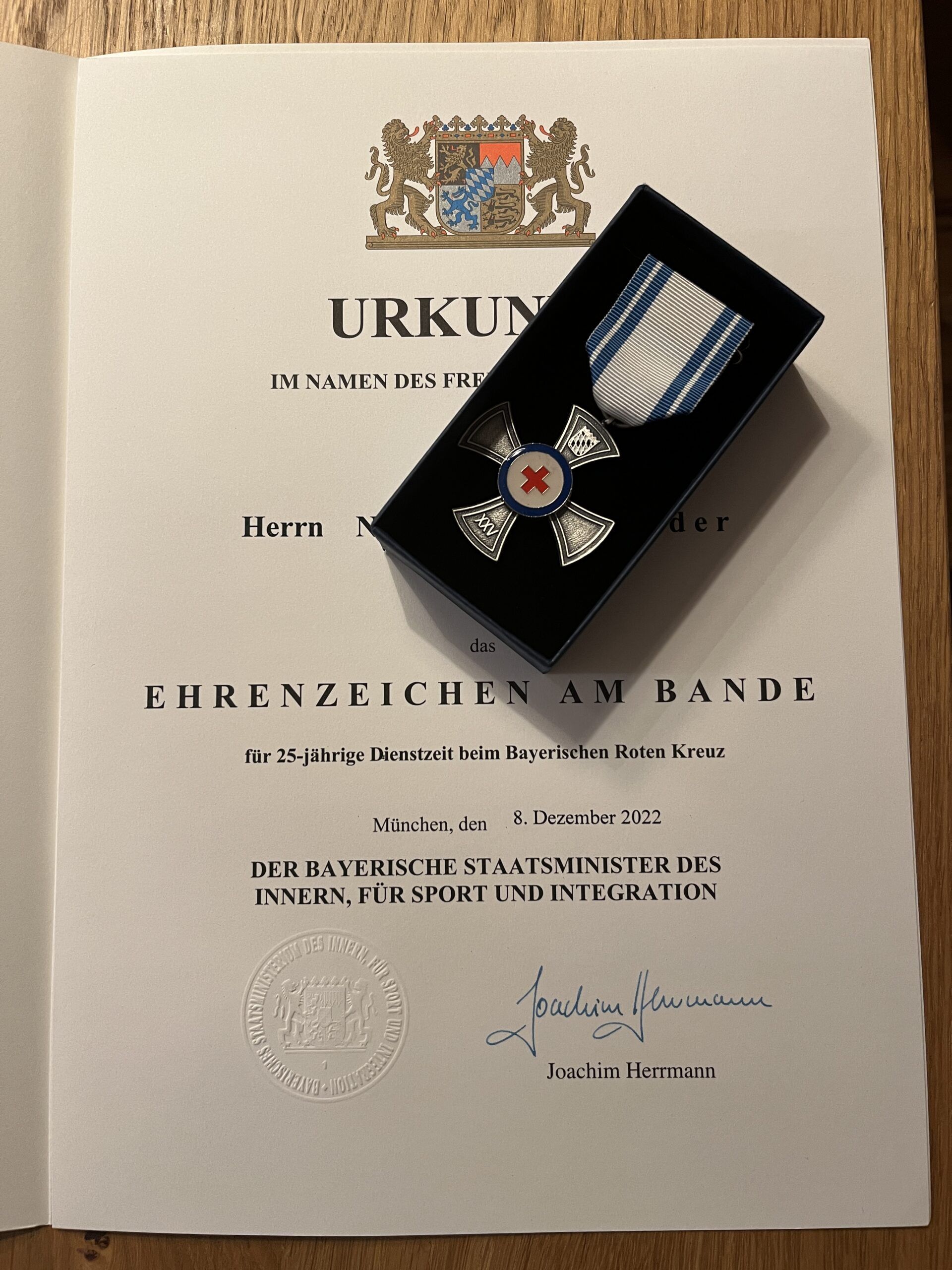 Innenminister Joachim Herrmann hat 38 ehrenamtliche Helferinnen und Helfer aus dem Landkreis für ihr langjähriges Wirken als Mitglied einer Hilfsorganisation ausgezeichnet. Einige der Geehrten sind bereits seit 50 Jahren aktiv. Coronabedingt wurden die Ehrungen der Jahre 2019 bis 2022 in diesem Jahr gemeinsam gefeiert. Künftig sollen die Ehrungen jedes Jahr stattfinden. Ausgezeichnet für 25 Jahre wurden: Karl-Martin Dippel, Thomas Sigmund, Wolfgang Schierle, Christian Steck, Thomas Brenner, Thomas Wolfgang Drexel (alle THW), Nico-Alexander Harder, Alexander Mayer, Monika Schabenberger, Christian Krameth, Martin Spengler, Sonja Seitz, Ilse Urban, Johanna Wassermann (alle BRK), Oliver Kovacs, Peter Proske , Tobias Katzer, Alexander Schneider, Michael Gröger, Doris Mayer und Iris Steiner (alle DLRG). Ausgezeichnet für 40 Jahre wurden: Bernhard Bamberger, Gerhard Bisle, Norbert Trey, Armin Rampp (alle THW), Christa Becker, Heidi Schepanski, Gerolf Domes, Jürgen Klemmer, Georg Nagenrauft und Kai-Uwe Kugelmann (alle BRK). Ausgezeichnet für 50 Jahre wurden: Peter Potsch, Harry Bendl, Friedrich Schroweg (alle THW), Wolfgang Eckhardt, Johann Rieger und Gert Spengler (alle BRK).