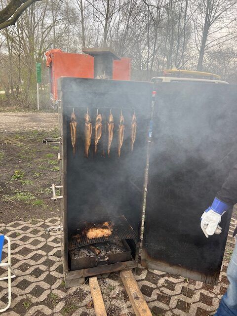 Im Anschluss und bei bestem Wetter genossen die Krumbacher Wasserratten, frische, in Wacholder geräucherte Forellen. Vielen Dank an unseren Räuchermeister Simon Zech sowie Georg Brugner für die besten Fische nach altem Rezept. Im Schatten unserer neuen Wachstation die hoffentlich in den nächsten Monaten fertig wird, genossen wir den herrlichen Tag!