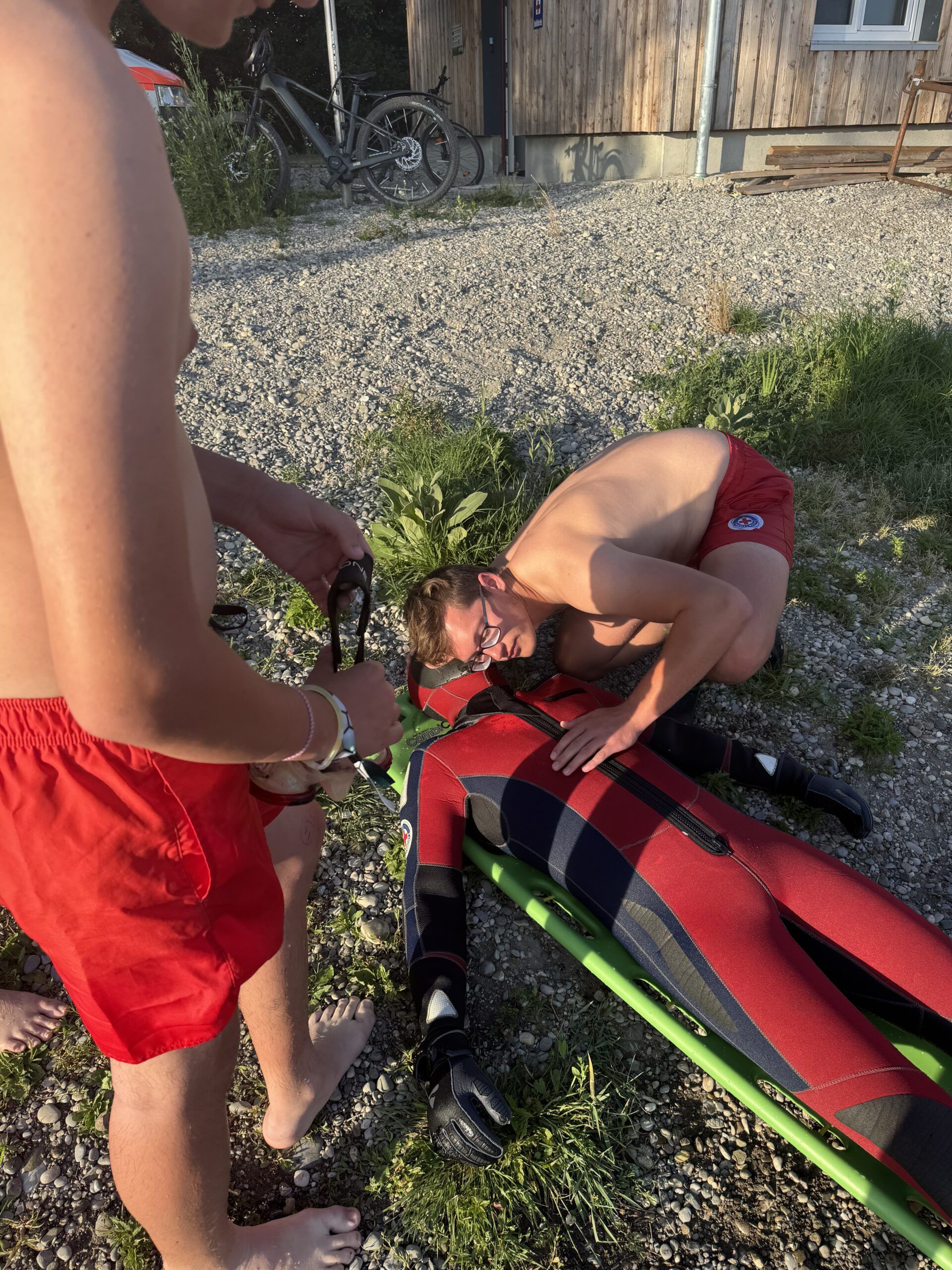 Am 23.6 führten wir eine Übung für unsere Wasserretter durch. Thema war das Retten eines verunglückten Tauchers. Wir starteten zunächst mit einer Theorieeinheit sowie dem Vorstellen eines Tauchgeräts sowie den Besonderheiten des Tarierjackets. Danach ging es in den See. Unser Vorsitzender schwang sich in den Tauchanzug und ließ sich zunächst im See treiben. Aufgabe war es den Taucher an Land zu bringen, von seinem Tauchgerät zu befreien und an Land zu versorgen. Danach wurde es schwieriger. Der Taucher legte sich auf 2-3 Meter auf den Grund. Die Wasserretter tauchten in Apnoe bei fast Nullsicht zum Taucher und brachten ihn mit Hilfe des Tarierjackets an die Oberfläche. Die aufsteigenden Luftblasen dienten als Orientierung für die Retter. Danach wurde wiederum im Flachwasser das Tauchgerät entfernt sowie der Taucher auf das Spineboard verlastet und an Land zur Versorgung gebracht.